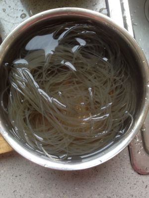 红薯粉用开水浸泡半小时,而后放进冷水中泡凉,下锅大火煮5分钟至粉呈透明状捞出