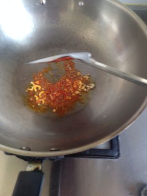 油锅烧热加入蒜末、辣椒粉烧成辣椒油,加入郫县豆瓣炒香