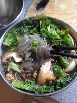 煮开后再依次加入香菇豆芽木耳粉条煮10分钟之后加入菜再熬煮5分钟,等待出锅 我已经流口水了
