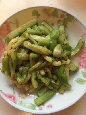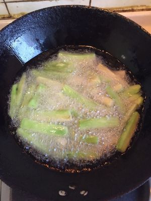 锅里放油,茄子先放进去炒熟。油可以比平时炒菜稍微多点儿,茄子比较吸油。炒好的茄子盛出备用。