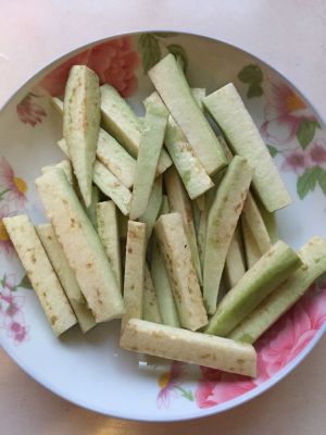 一个大茄子削皮切成长条,用盐腌十分钟。