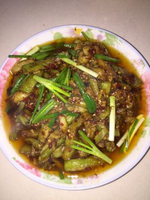 3.将油烧热,把茄子放进去炸2-3分钟捞出,再用小火把油烧热,将葱姜蒜爆炒香加入豆瓣,再将茄子倒入翻炒3-4分钟,加入盐,醋,糖(有冰糖最好,可以提色),最后勾芡起锅!!