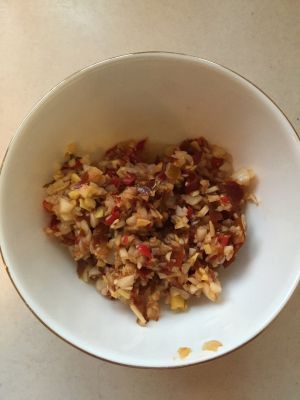 2.将茄子加盐腌10分钟左右,待茄子出水后用手挤干,