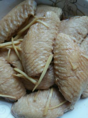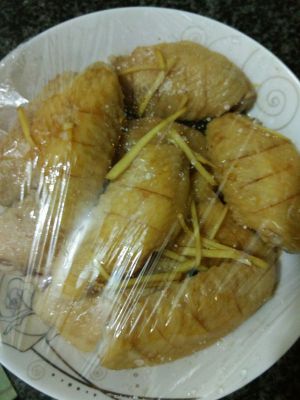 鸡翅用水焯一下,焯时切点姜片,去腥,然后倒点黄酒,鲜酱油,放姜丝盖上保鲜膜腌制