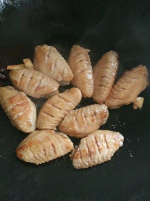 放入鸡翅翻炒,至泛黄。