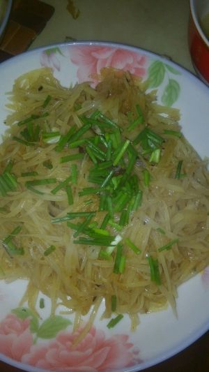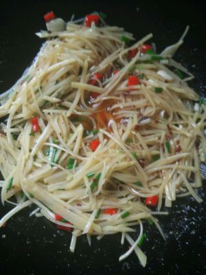 中间过程都忘记拍了。锅放油烧热,花椒下锅过一下,把花椒捞出来(注意油温不要太高哦!)放入少许蒜头,翻炒一下倒入土豆丝再翻炒,加入鸡精,盐,糖,再翻炒。加少许醋,迅速翻炒下,装盘撒葱花。