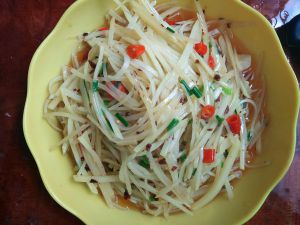等辣椒颜色变青后放入土豆丝,一起翻炒。这时到入盐,醋,(个人口味即可)。加入少许水,待土豆丝炒成黄色时加入胡椒粉,味精,估计翻炒5-6分钟即可。