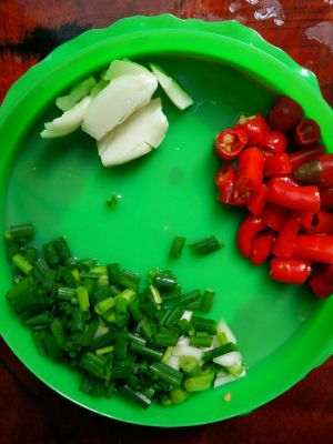 在把青椒或者辣椒红辣椒都可以,洗净,切丝。