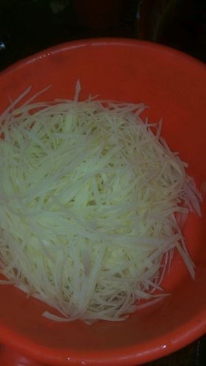 马铃薯去皮切丝,过一下水去去马铃薯的淀粉。沥干备用
