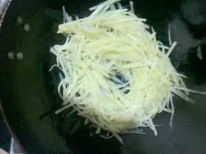 倒油烧热,当盐,下土豆丝,生姜丝,蒜丝…快速翻炒