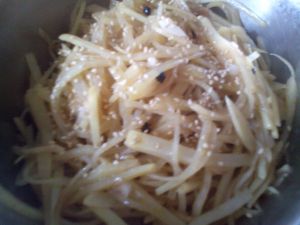 炒匀撒上芝麻盛盘吧,记住土豆丝是旺火快炒,不用太烂,脆脆的好吃,但也不能太生哈!