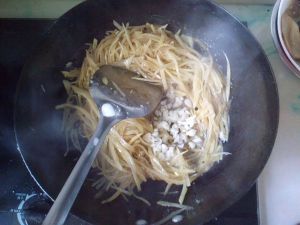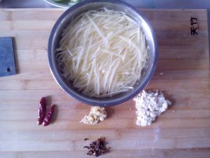 土豆切细丝泡水洗净控干,姜,蒜切末,