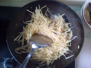 下去土豆丝和姜末,倒入适量陈醋翻炒