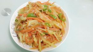 锅内加水烧开,放入土豆丝煮透捞出,过凉开水,沥干水分装盘