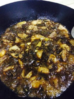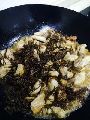 开锅倒入梅干菜炒制均匀,加入正好盖过梅干菜的水,中火烧;