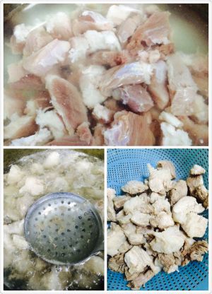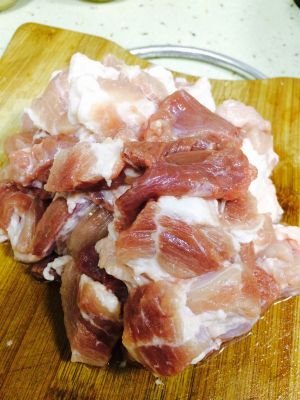 把夹心猪肉洗净切成小块状。(其实用五花肉最佳,因为家人都喜欢吃瘦一些的,所以选用夹心肉)