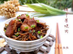 五花肉下锅煸炒变色,加入料酒,温水,焖片刻,再加入蒸好的梅干菜,加水,加冰糖,水多点一次放够,先大火烧开,加一勺老抽着色,然后小火30分钟