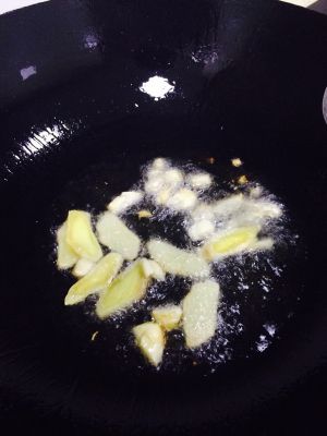 锅内加油烧热,加入葱姜和八角,炒出香味。