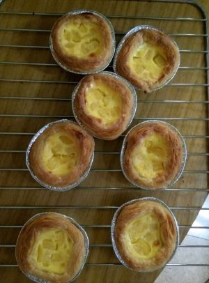 烤到一半可见中间的蛋黄鼓起高高的泡,满屋飘香,叮咚~烤好了^_^蛋挞皮层次分明、酥酥脆脆,里面的鸡蛋嫩滑的不得了!趁热开吃咯!