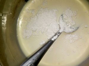 等牛奶冷却,把低筋粉、蛋黄液倒入一起搅拌
