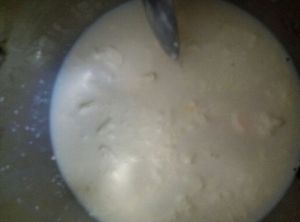 加入全蛋液、纯牛奶、淡奶油、糖和炼乳,手动打至均匀,不可过度以免打发