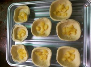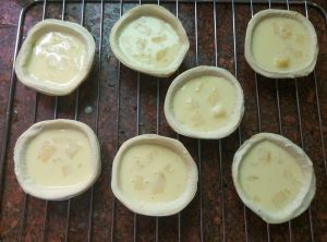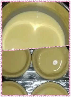 倒入解冻好的蛋挞皮内,八分满就可以。放入预热好的烤箱内200度26分钟