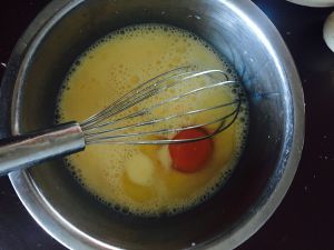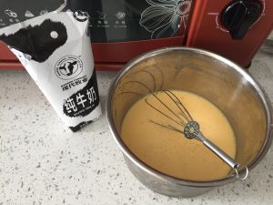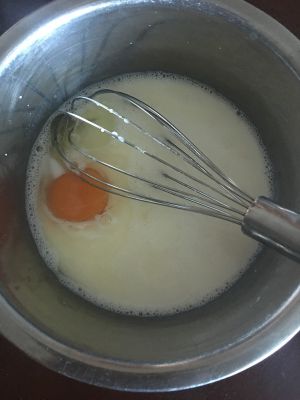 250g牛奶加入糖搅拌至糖融化,加入一个全蛋搅拌均匀