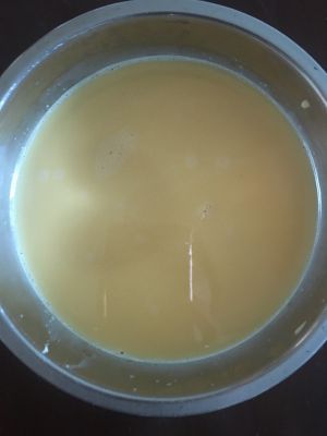 纯牛奶倒入容器中 加入两个鸡蛋 用打蛋器充分打匀 加入淡奶油继续搅拌 然后置于火炉上 加砂糖炼乳 让去充分融化 之后冷却 最后过筛几次让蛋液更细腻些