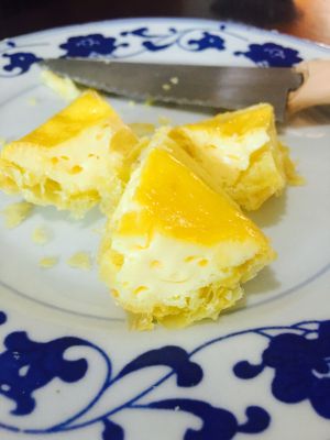 烤的时候可以观察到挞液一直膨胀,这就是为什么不注满挞液缘故。表层有点焦黄色出现,证明快好了。