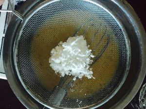 用分蛋器把鸡蛋的蛋黄和蛋白分离。蛋白去掉不用,留着蛋黄搅拌均匀待用!