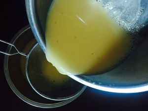 在牛奶中加入淡奶油,和蛋黄,搅匀,过滤一遍,口感更细!