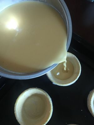 在蛋挞皮了加入适量的蛋挞液,不要太满,七八成就好了。