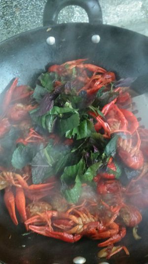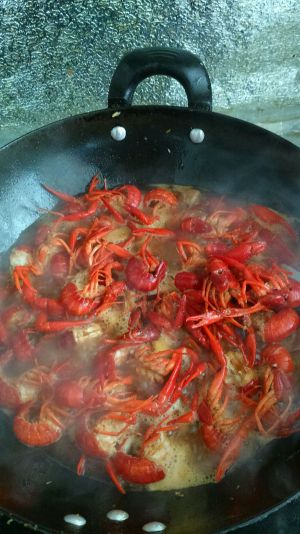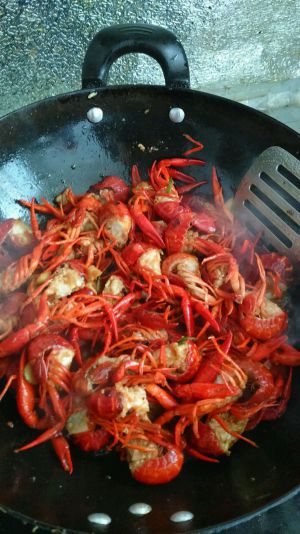 辣椒花椒香味出来后,倒入虾子翻炒,建议可加入一块猪油炒,味道更香腻,(一般全身红透即可为熟)