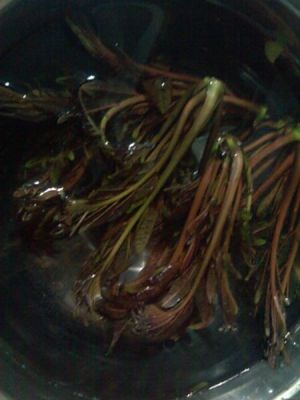 将香椿在盐水中泡15分钟,盐水洗尽。