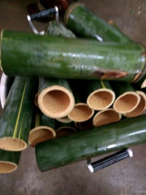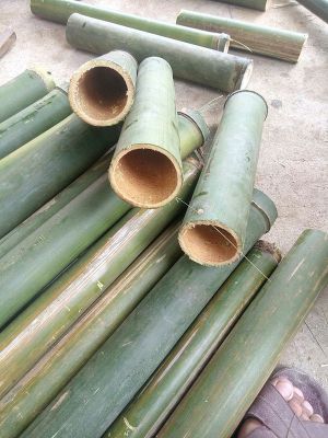 取新鲜竹子(径粗5-6厘米,竹节不小于30厘米)一段,当然也可以多段,看人数而定,下端留有竹节(竹节之下最好削尖便于插在地上),上端开口。