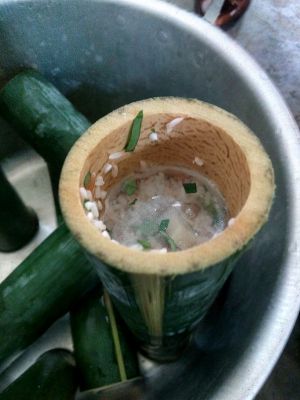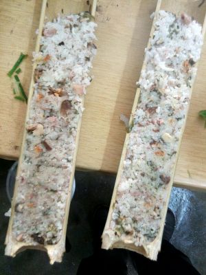 4 全部材料混合在一起后装进竹筒,不要装太满,倒进水浸到米(这个很重要,没水米蒸出来就是干的)
