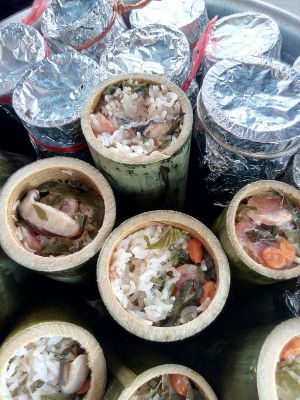 用铝薄、或菜叶、或竹叶塞住竹筒口后,吧竹筒围着火堆竖直或插或摆放, 注意不要倾倒,火烤约半个小时