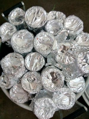 5 拿锡纸和线褒住竹筒放进大铝煲,倒进水后盖上盖子蒸1小时(不到四十分钟的时候掀开一个看看米有没有熟就行了)