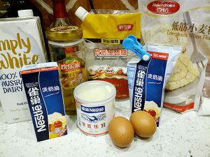 纯奶,淡奶油,炼乳,白砂糖按比例倒入容器,隔水加热至白砂糖融化。 冷却后倒入打散的蛋黄和低筋面粉。 筷子充分搅拌,然后过筛(液体一定要过筛,比较细腻)