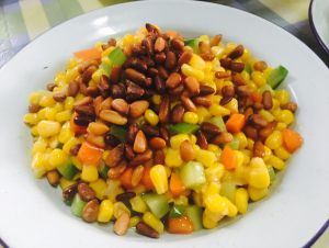 倒入玉米翻炒一下,放入盐,糖继续翻炒,然后放入松仁