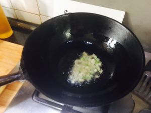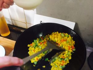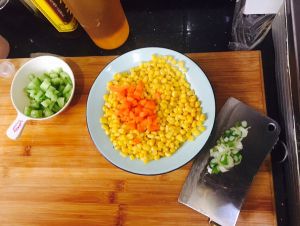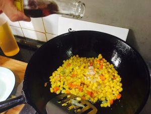 锅中油热后,放入葱花炒香,胡萝卜丁翻炒均匀,放入豌豆粒、玉米粒翻炒两分钟;