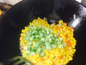 胡萝卜,黄瓜,玉米一起放炒一下 放一勺糖,半勺盐 一汤勺料酒