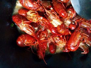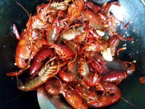 起油锅,下姜蒜,中小火爆香,倒入干辣椒段,洗净的小龙虾,改大火翻炒。