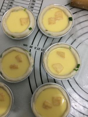 预热烤箱,把饧好的挞皮放上挞液,放入烤箱180度,25分钟