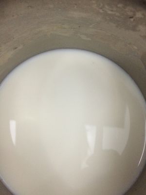 牛奶加入奶锅内,加入20克白糖小火加热,加热的过程不停搅拌,直到糖融化