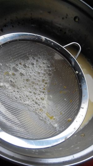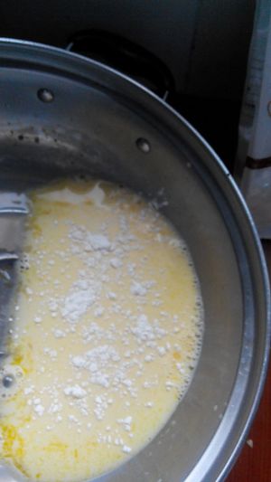 淡奶油+牛奶+糖隔热水到糖完全融化,加入蛋黄,筛入低筋面粉混合后过筛两三次。放冰箱冷藏备用。用之前先拌匀再用以免有沉淀。