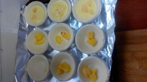 摆好蛋挞皮,在蛋挞皮里放入切好的黄桃