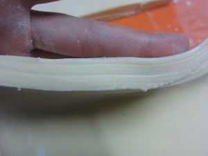 将面团放在撒了防粘粉的案板上擀成比裹入黄油宽一些并三倍长的长方形。将裹入黄油放在中间,两边叠起来,有开口的一面对着自己,上下将面团擀成原来差不多大的长方形,两边对折。这为之一次三折。放冰箱冷藏半小时。一共进行三次三折,每次折完后都需冷藏。每次擀面团都需要撒防粘粉,这样才不会破皮。最后做出来的酥皮切面十分漂亮。