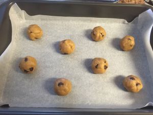 用厨房秤称量,每个曲奇25g, 配方可以做12个曲奇。称好后用手将其搓圆压扁,间隔摆放在铺了烘培纸的烤盘上