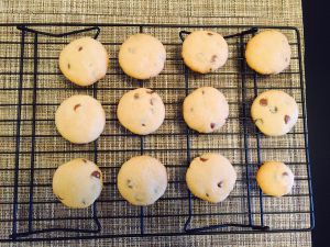 烤好后是这样的,曲奇不拘泥于形状,如果你喜欢颜值高的可以用裱花嘴做形状,但是最好就用巧克力碎不用巧克力豆,因为怕堵花嘴。